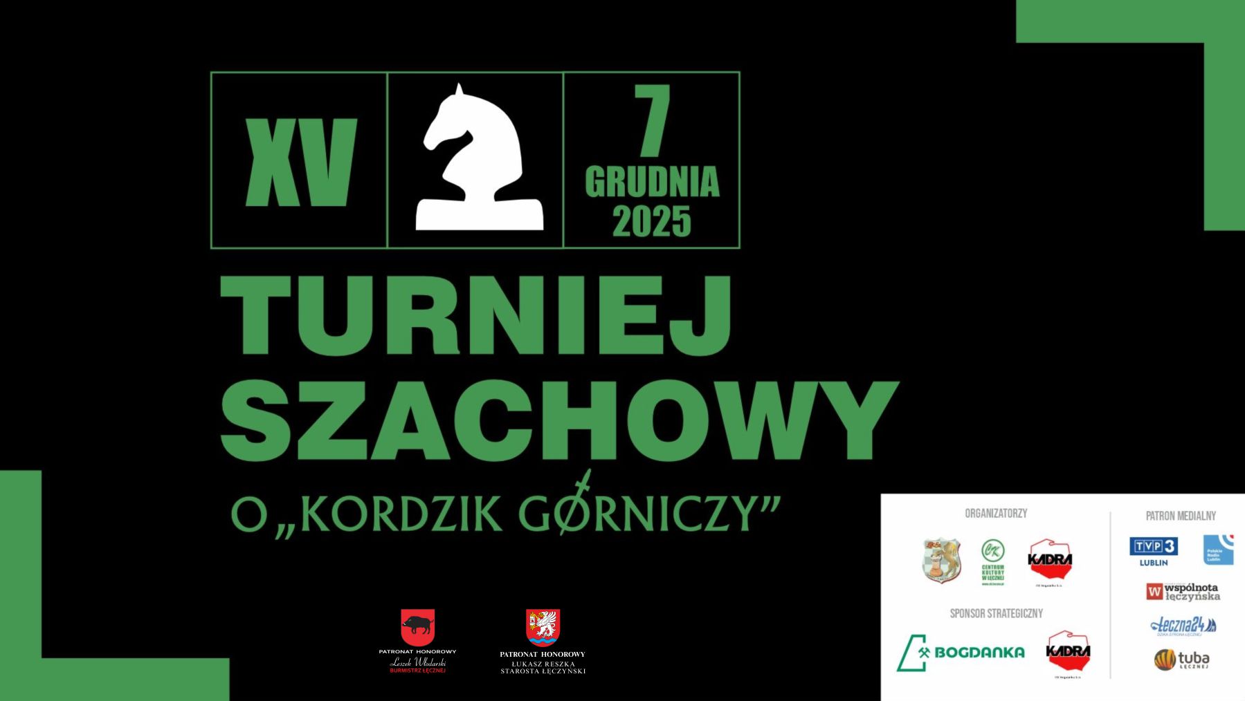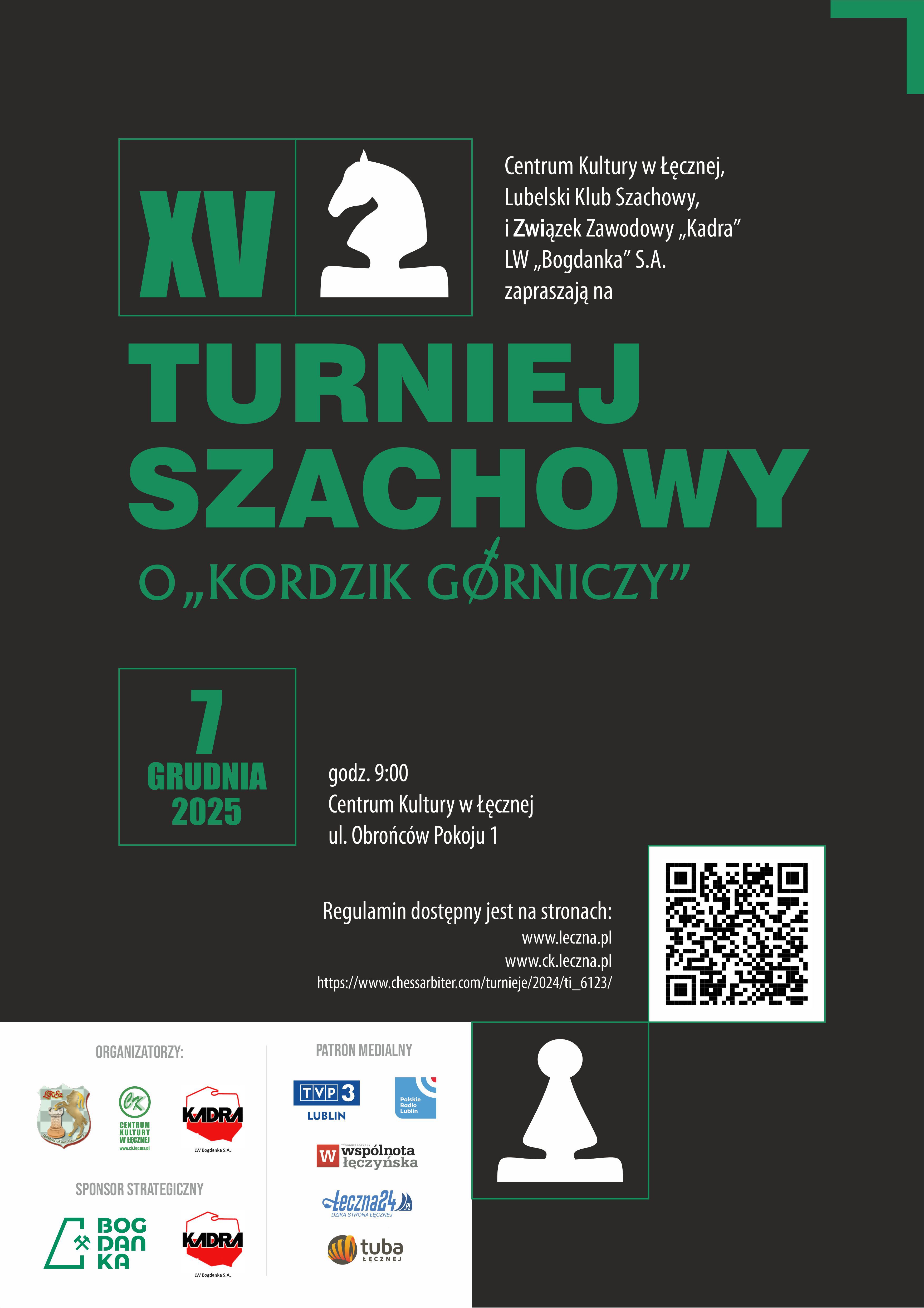 zapraszają na imprezę środowiskową p.n.: XV Turniej Szachowy o "Kordzik Górniczy" Łęczna 2025, który odbędzie się 7 grudnia 2025 r. w Centrum Kultury w Łęcznej przy ul. Obrońców Pokoju 1.
